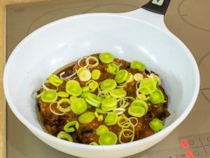 - Добавете пръстените лук, затворете капака и продължете да къкри друг десет минути.
