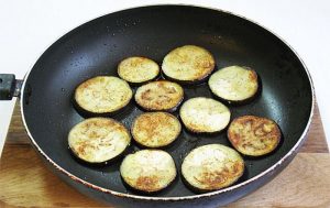 - Измийте патладжана и нарежете на тънки кръгчета. За сол. Запържете от двете страни в зехтин. Поставете кръгове хартиени салфетки, за да направите стъклено излишно масло.