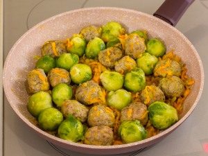 Брюкселско зеле, приготвено у дома с вкусно кюфтета. Пълна вечеря, две в едно, месо със зеленчук гарнитура, приготвя се лесно и бързо.