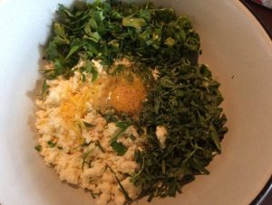 - Нарязваме ситно зелените. Смелете сиренето в купа, добавете яйцето и Зелените. Смесваме всичко.