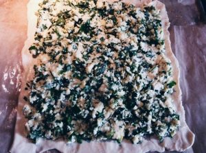 - Предварително размразяване бутер тесто. Пергаментен грес масло. Разточете тестото и го сложете върху пергамент. За тестото сложете пълнежа и разпределете.