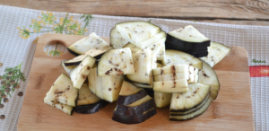 - Можете да обелите патладжана или можете да оставите корите, както вие повече като това. Нарежете патладжана на кръгчета, поръсете със сол. ако кръгчетата са твърде големи, след което ги нарежете на още 2-4 части.