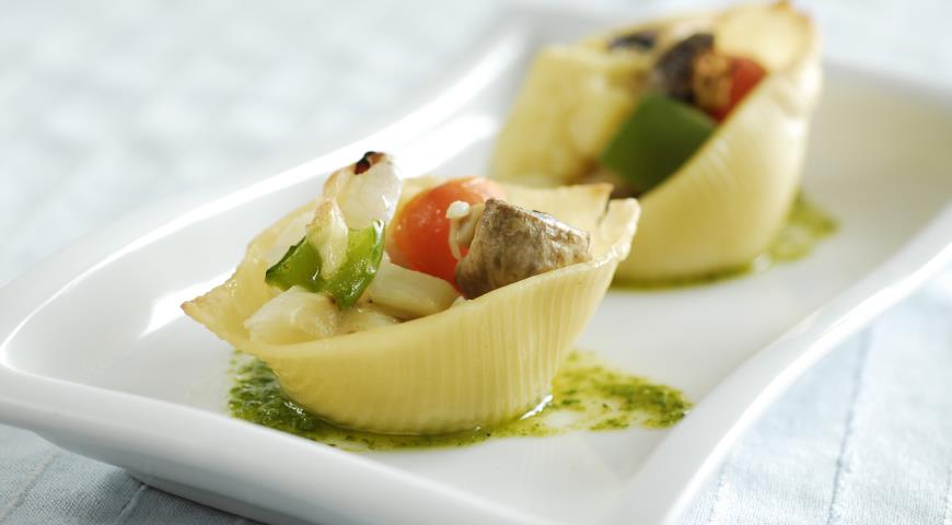 - Загрейте фурната до 180 градуса. Слагаме черупки лист хартия за печене, покрита с хартия за печене, залейте със сос от рукола и изпратете във фурната за 5 минути. Приятен апетит!
