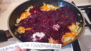 - Обелете морковите и чесъна, настържете, нарязайте лука кубчета. Охладете цвеклото и три на ренде.