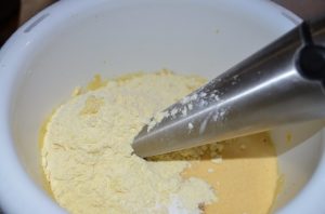- Добавете яйцата, млякото, кефира и изварата, разбъркайте.