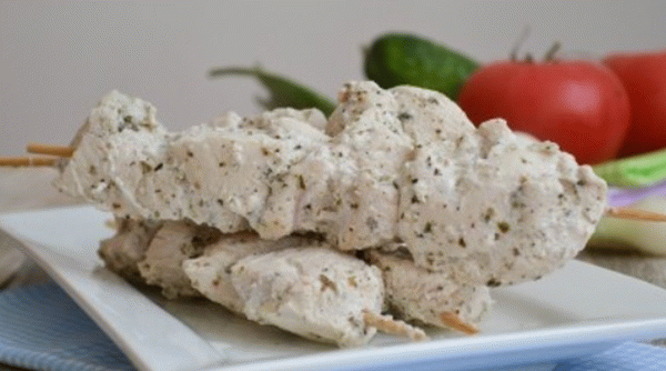 - Мариновани парчета, здраво нанизани на дървени шишчета.