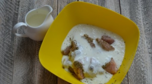 - Сложете в дълбок съд, сол и поръсете с провансал билки. Изсипете кефир, така че да покрие напълно месото. Влагаме хладно място за 30 минути за мариноване.