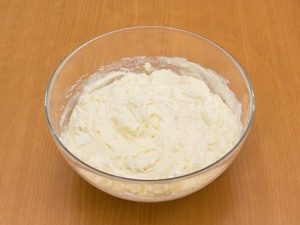 - За теста в купа смилайте гранулирана захар масло, разбийте яйцата, разбъркайте. Изсипете пресятото брашно бакпулвер, омесете неварено тесто.