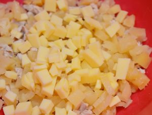 Докато приготвяте тестото, сварете пилето за 25 минути в осолено вода, охладете, нарежете на малки парченца и изпратете до купа.