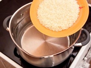 - Налейте 2,5 литра студена вода в четирилитров съд. Изсипете измитата вода във вряща вода, докато стане бистра кръглозърнест ориз.