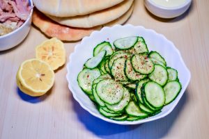 - Краставиците ми, нарязани на тънки филийки. Краставици от краставици туршия в зехтин, лимонов сок, сол и черен пипер. Около пет до седем минути.