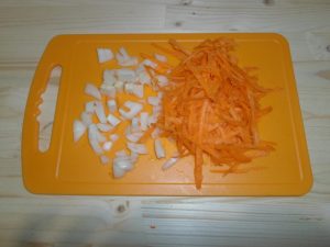 Сотирайте зеленчуците в олио, сол и черен пипер.