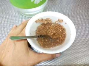 - За да направите елдата по-ароматна и вкусна, първо необходимо е да го запържите в сух тиган. Изсипете зърнените култури с вода и оставете за 15 минути, оставете да набъбне.