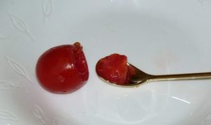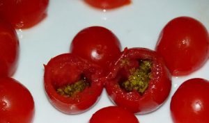 - Отрежете внимателно върховете на доматите, без да повредите стените череша, с чаена лъжичка извадете пулпата и включете хартия кърпички, изцедете сока.