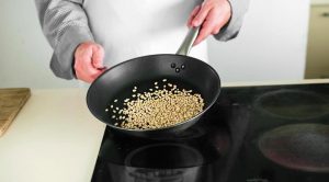 - Запържете ядките в сух тиган на среден огън, не забравете да разклатите тигана, за да не изгорят ядките. Запържете за около 2 минути. Изсипете в купа.