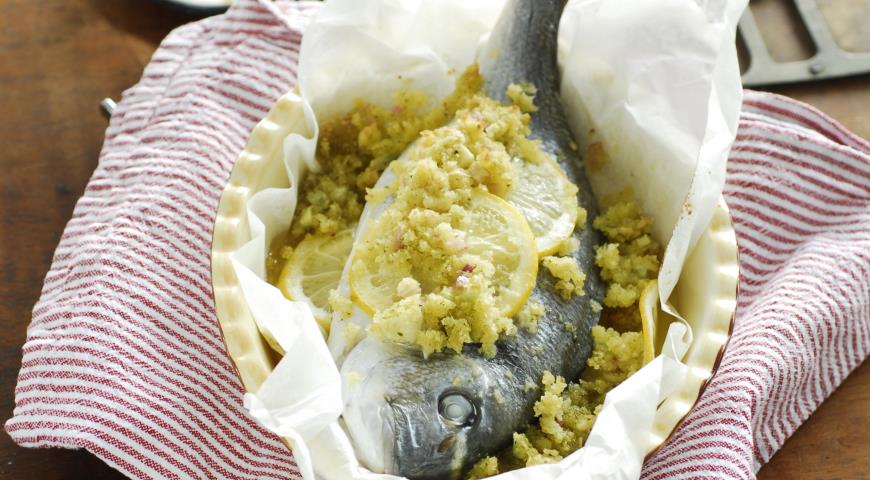 - Поставете рибата върху пергаментова хартия, гарнирайте с лимон и чесън. Поръсете всичко отгоре с трохи и изсипете марината.