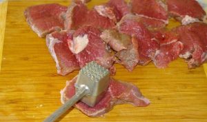 - Нарежете месото на парчета с дебелина 2 см. Разбийте, сол, черен пипер.