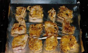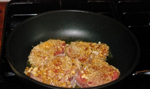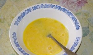 - Потопете всяко парче месо в яйце, след това в галета бисквити.