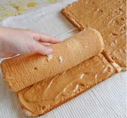 Тънката гъба торта се пече много бързо. Внимавайте да не го направите повреди, издърпайте го от форма, бързо намажете с варено кондензирано мляко и увийте. Направете това с ръкавици на фурна или гответе ръкавици ръкавици без пръсти. Рулото може да се консумира горещо или студено.