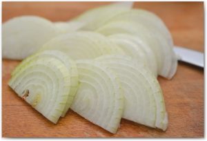 Нарежете лука на пръстени и го запържете в мазнината, която образувана след пържене на бекон. Лъкът трябва да стане златист.