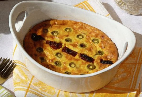 - Поставете домати от маслини в останалата половина от изварата (оставете настрана част), разбъркайте, изсипете във форма, подравнете. За украса отложени домати, маслини.