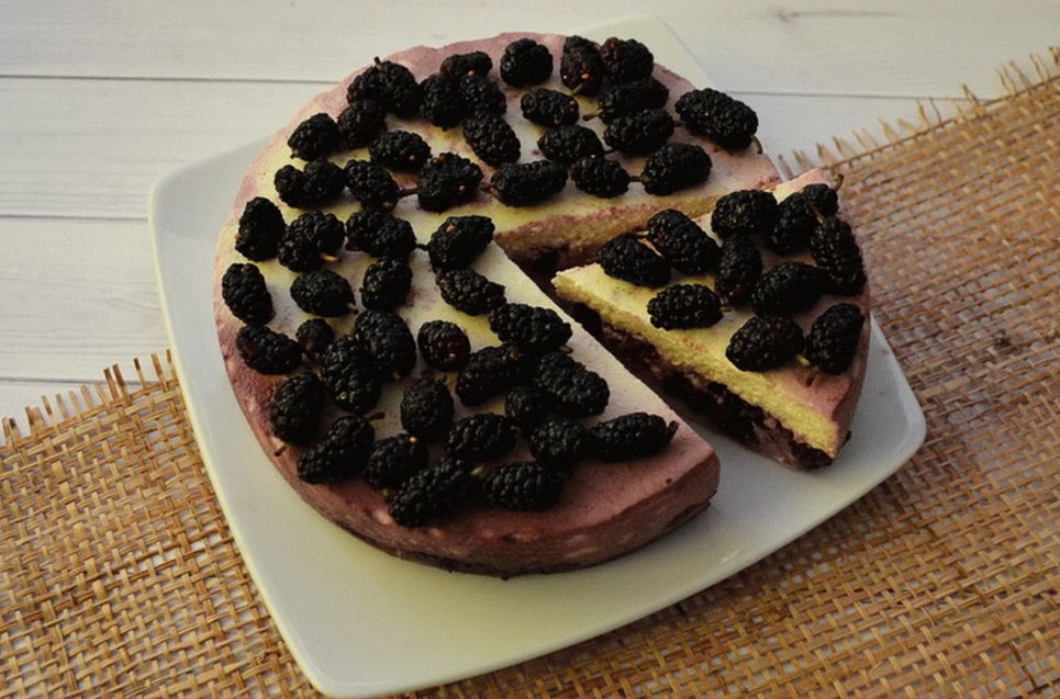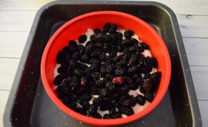 - Разстиламе половината маса в силиконова форма, отгоре разпространете плодовете на черницата.