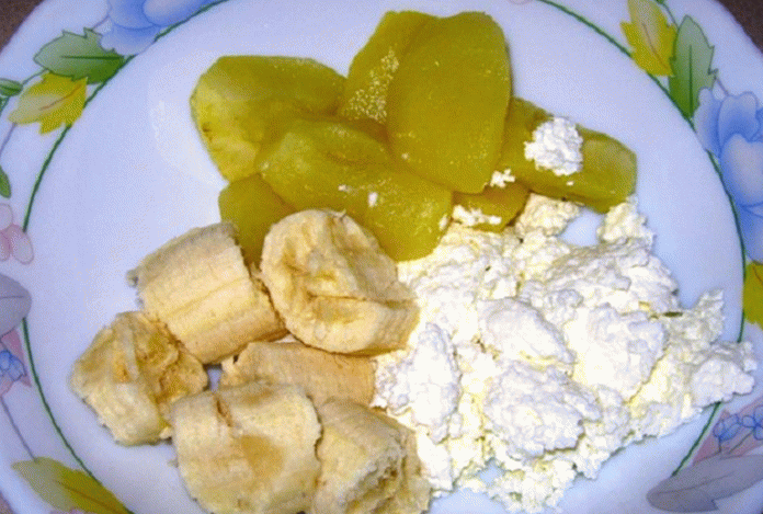 - На последния етап поставете изпеченото в купата на блендера ябълки, обелен банан и прецедено извара. Размахвайте всичко, докато не получавайте ефирна хомогенна маса. Дръжте изварата вътре не повече от един ден в хладилник.Смесете изварата с плодовете Необходимо е непосредствено преди хранене на детето.Добавете захар Изварата не се препоръчва.