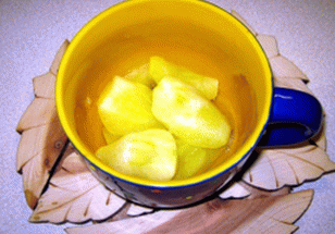 - Сега в микровълновата печем ябълки. За това парчета сгънете обелената ябълка в подходящ съд и поставете вътре микровълнова за 4 минути.