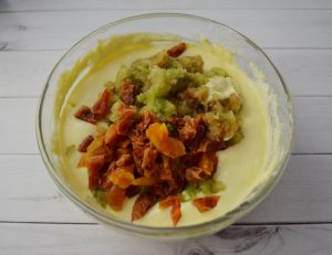 - Разтриваме ябълката, нарязваме сушените кайсии на парчета, добавяме към тестото.