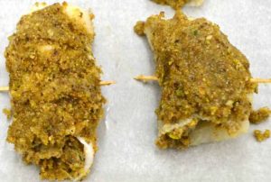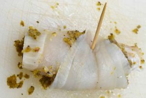 - Сложете тази смес върху филето, увийте на руло и закопчайте с клечка за зъби. Сложете сместа отгоре на рулцата.