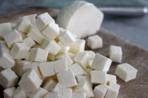 Нарежете сиренето моцарела на малки кубчета (24 бр.).