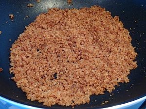 - Изсипете 1 супена лъжица олио в тигана, добавете бисквити и пържете, смущавайки през цялото време. След 5 минути добавете захар с канела, намесваме и отстраняваме от огъня.