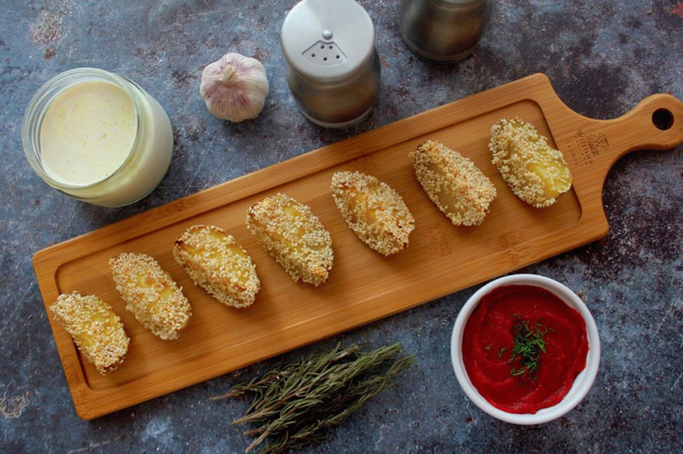 Ако се подготвяте за пикник, барбекю или барбекю, тогава предварително грижете се за закуски и гответе вкусни картофи у дома в сусамово палто! Той ще бъде идеалното допълнение към барбекюто. Можете да го направите на фурна, той е подходящ и за бирено парти или събирания с приятели. Сервирайте с домат или сирене сосът.