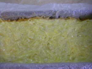 Покриваме дълбоката форма за хляб с хартия за печене, намазваме олио и разпределете приготвената смес от картофи (½ част).