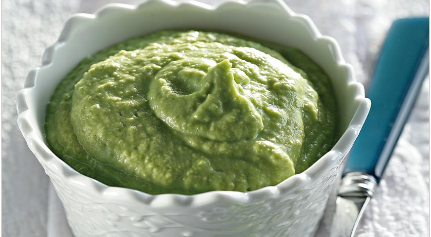 - Хвърлете грах и лук в гевгир и след това нарежете на ситно млечен блендер. Приятен апетит!