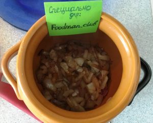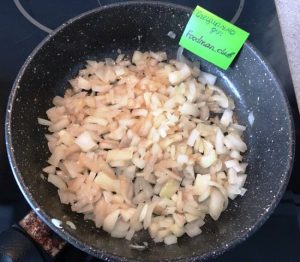 - Нарежете лука на малки кубчета, сложете в тиган и сотирайте на слаб огън. Добави чаена лъжичка винен оцет и оставете да къкри още няколко минути.