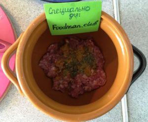 - Добавете сол, черен пипер и куркума към каймата, разбъркайте всичко. Да изложим първи слой до дъното на саксията.