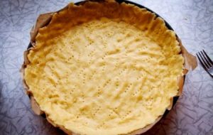 - Покрийте съда за печене с пергаментова хартия, поставете в нея тесто и разтегнете отстрани. Пиърс с вилица в няколко места.