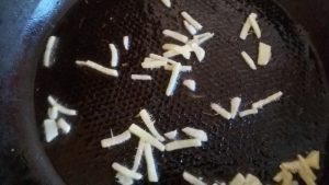 - Изсипете олио в предварително загрят тиган и запържете джинджифила за 1 минута.