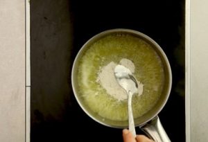- Поставете 2 супени лъжици растително масло в задушено ястие, както и масло. Разтопете. Постепенно заспивайте с брашно и разбъркайте, без да оставяте бучки до гладкост.