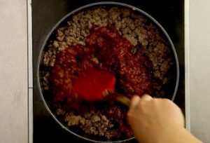 - Пълнене на кайма, докато се свари наполовина. Добавете соса болонезе поръсете със сол и черен пипер на вкус.