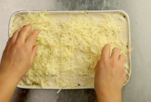 - Намазваме последния слой листа със сос бешамел, отгоре поръсете със сирене (колкото повече, толкова по-вкусно). Оставете да стои някъде 7-10 минути. Сложете във фурната и печете около 30 минути.