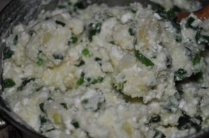 - Разтрийте изварата малко, добавете картофено пюре, зелено лук, разбъркайте всичко.