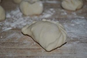 - Разточете тестото в наденица и разделете на малки парченца. Изправим топки от тесто, навиваме топките в спретнати питки. В средата на питите поставяме пълнежа, свързваме краищата и щипка красиво.