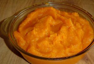 - Измийте и почистете тиквата от кожата и семената. Нарязан обелен тиква и я печете във фурната за около 40 минути. След това рециклирайте печена тиква с пасатор до състояние на пюре.