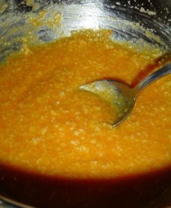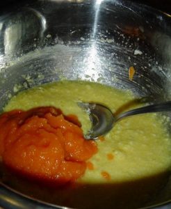 - Разтрийте омекналото масло със захарта, карайте там същото яйце, добавете ванилин, кокос и пюре от тиква. всички разбъркайте старателно.
