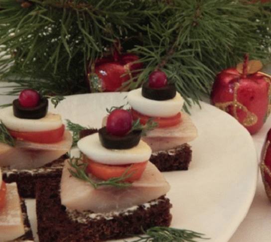 - Разстиламе извара на тоста, слагаме отгоре херинга, сложете домата, яйцето, маслините и червените боровинки. Ние украсяваме всичко Зелените.