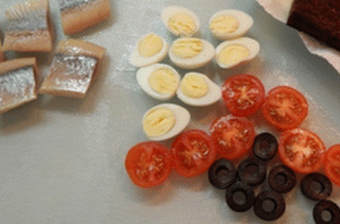 - Нарежете рибата и яйцата на средни филийки, нарежете доматите на половина. Нарежете маслините на кръгчета.