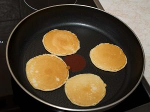 - Сложете тигана на огъня. Загряваме го добре, омазняваме го масло или растително масло. И изсипете тестото в тигана с помощта на лъжица. В същото време изпържваме няколко палачинки (така че палачинките да са сухи, по-добре е да използвате креп производител с малки клетки). Запържете ги от двете страни, докато красива златиста кора.