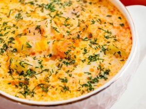 Вкусна кремообразна вегетарианска супа гответе у дома със зеленчуци и прясна риба.